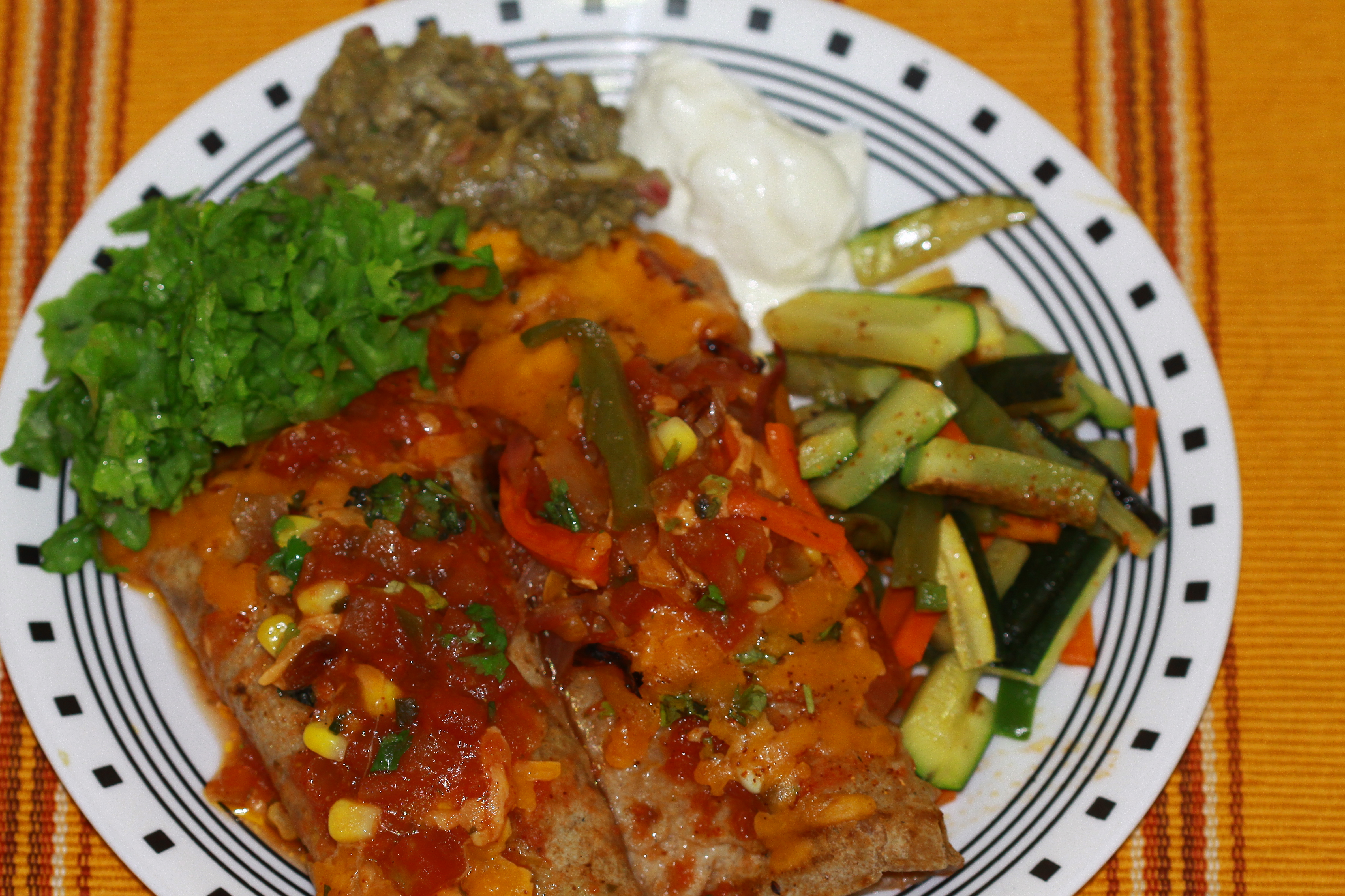 An Enchilada is a corn or flour tortilla rolled tightly around a filling and baked in a sauce. With the modifications in the diet and to suit ones tastes one can change the type of tortilla or filling or the sauce to make it more healthy and filling. In this case I used whole wheat tortilla from Whole Foods, roasted veggies for the filling, and medium tomato salsa and tangy tomatillo salsa for the sauce. As always, my all time favourite mexican restaurant has been Macayos and as far as Enchiladas goes…it has always been a personal favourite of mine..served with dollops of guacamole, salsa  and sour cream its a gratifying meal in itself.