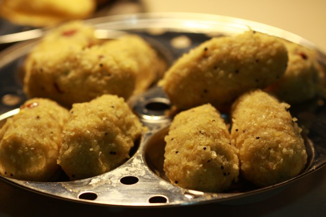 - Grease the idli plates and place all the kozhukattais on them all ready to be steamed.
