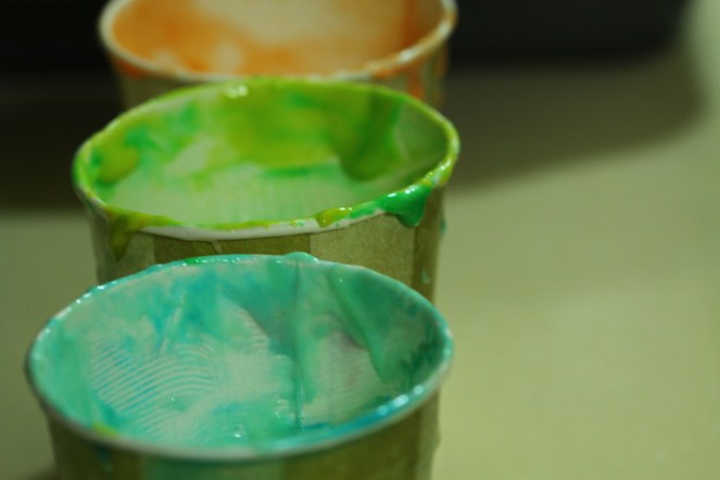 - Add drops of food coloring – I used the 4 food colours of Red, Blue, Green and Yellow to create purple, dark blue, turquoise, green, yellow, orange and red.