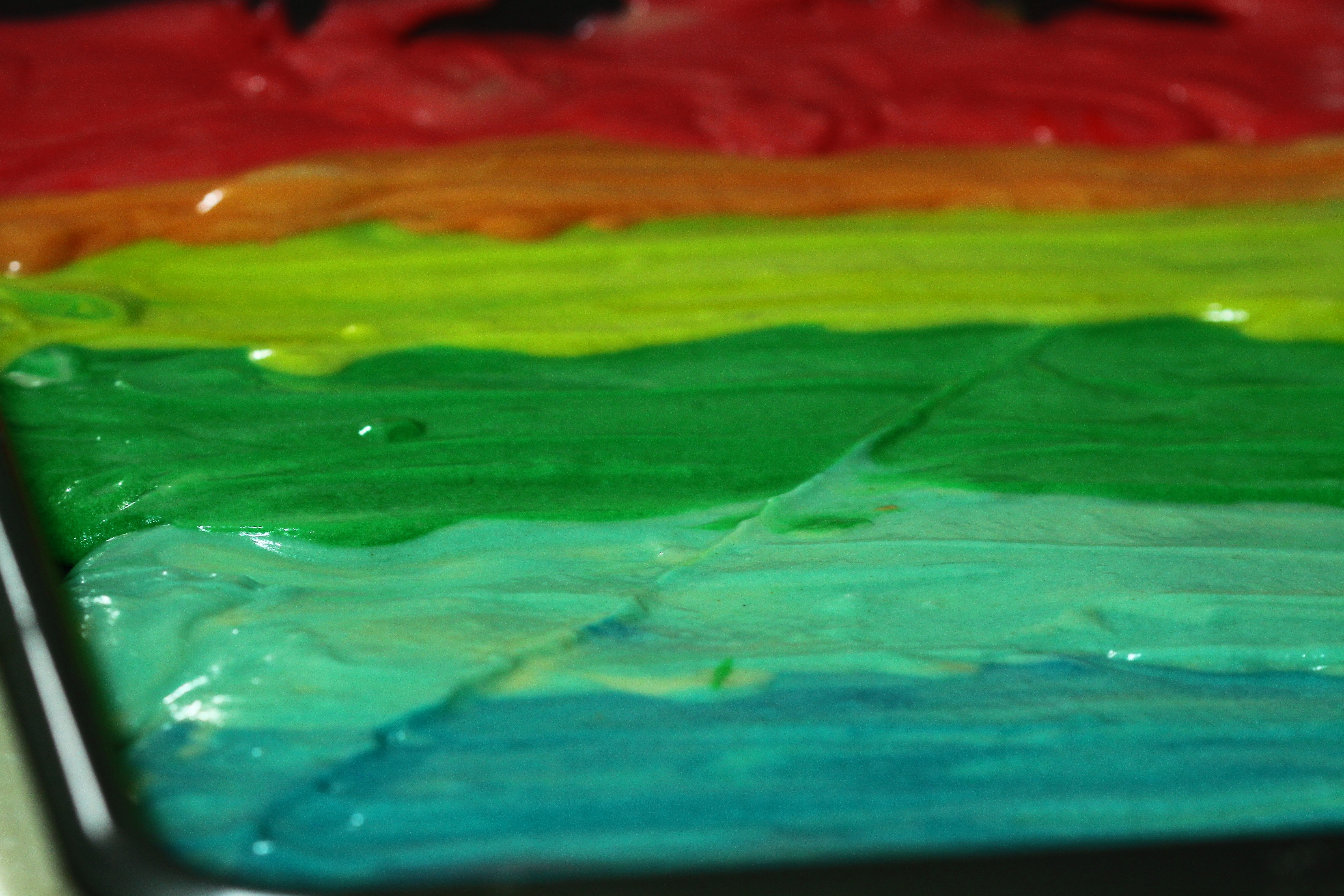 - I layered them one after the other in a square baking pan and smoothed them to create a xylophone effect