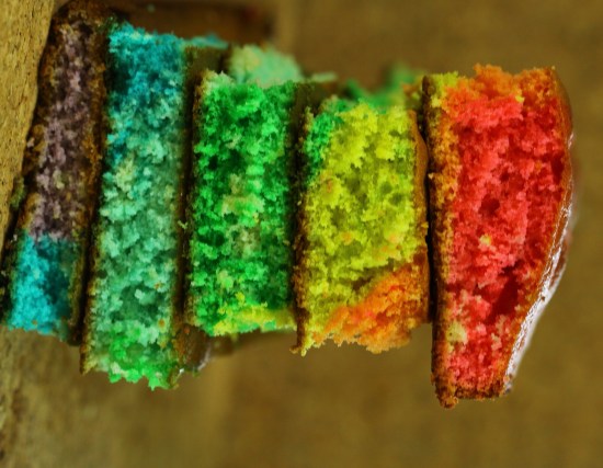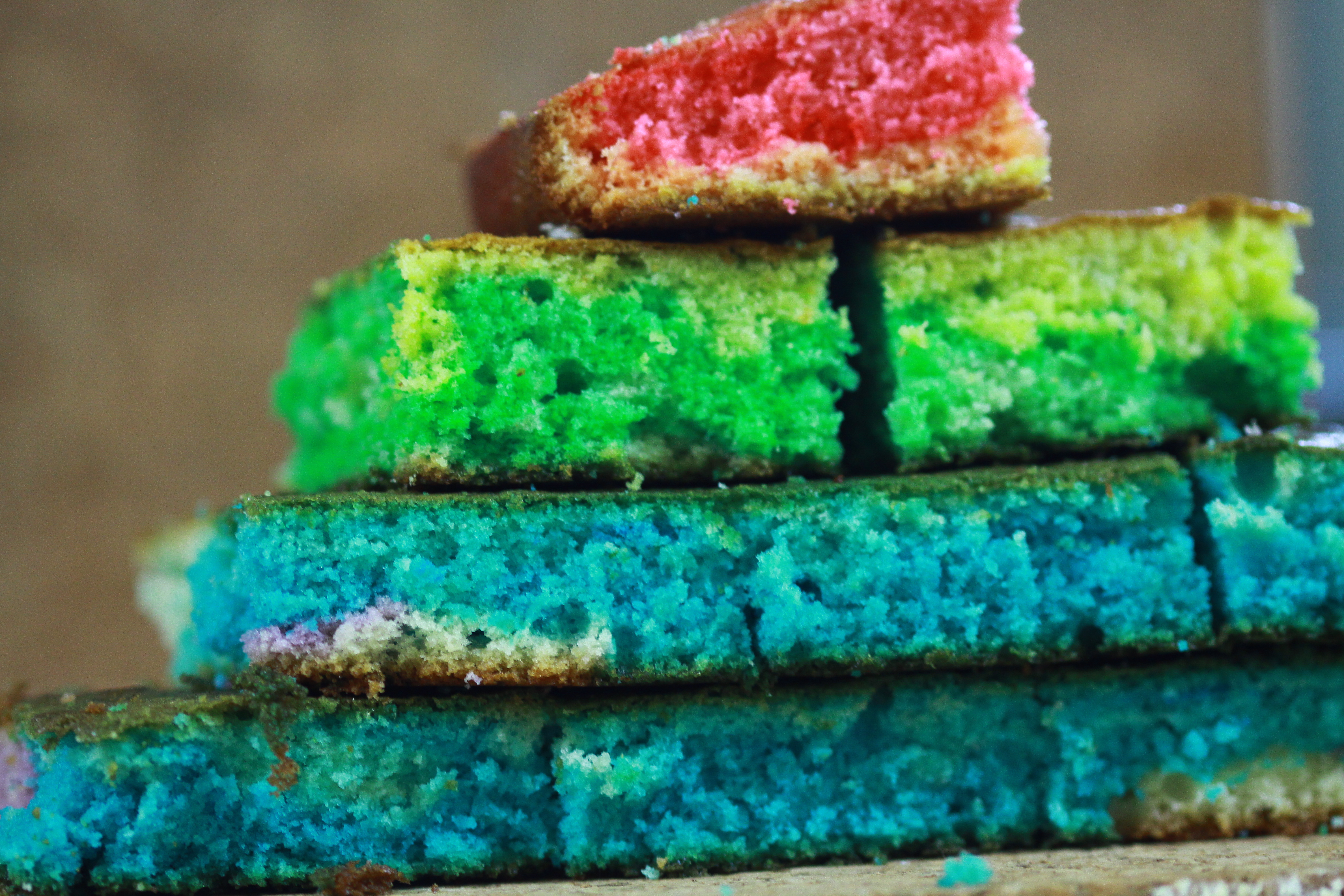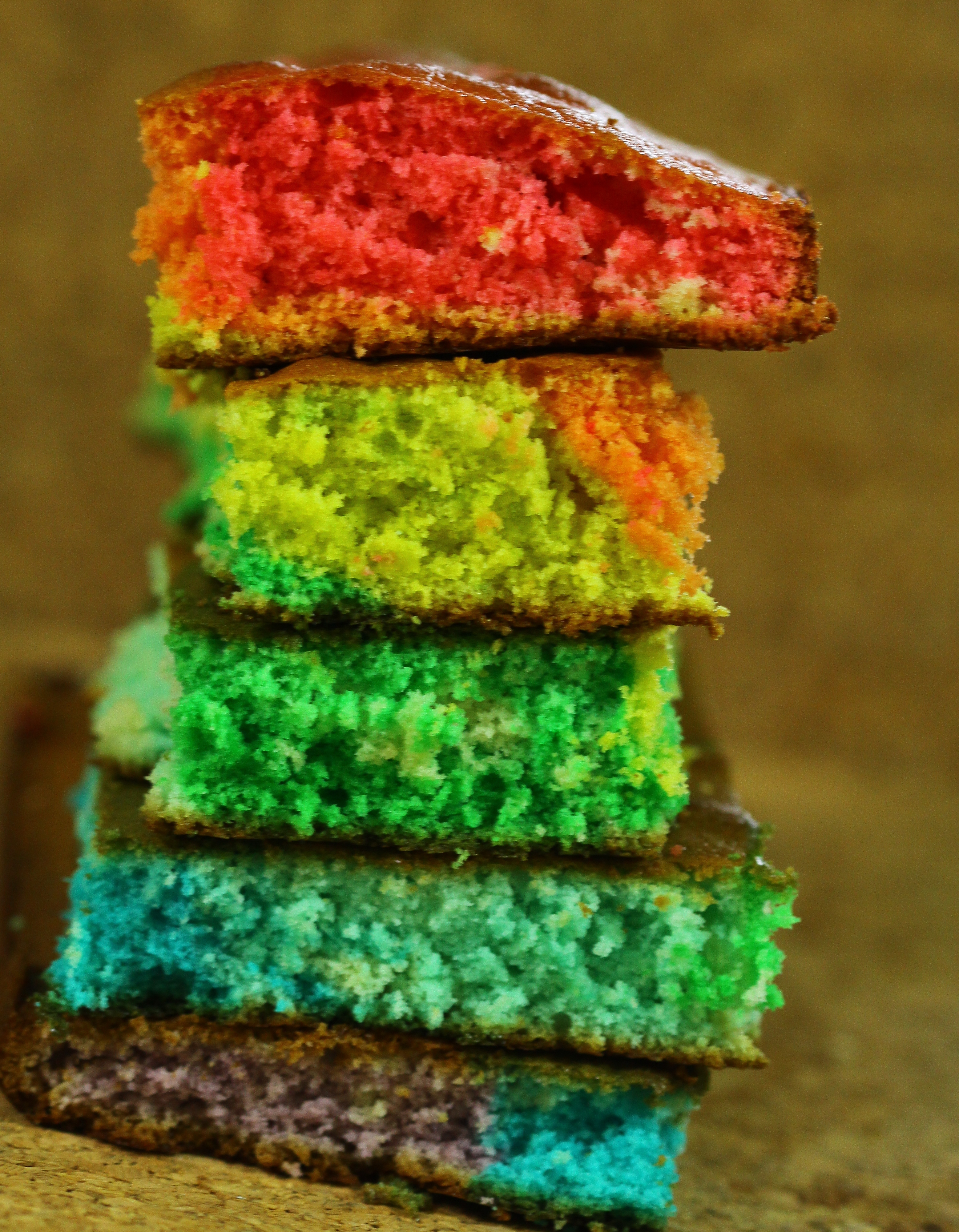 As a little girl, I always had a fascination with colors and shades, just like any little girl of my age. I remember going so crazy happy seeing my neighbours etch lovely rangolis and fill them up with all the colors of the rainbow. Every year, my school held competitions for Rangolis and we used to plan to fill up the rangolis with imaginative colors and fillers. There was once we mixed color rangoli powder with rock salt to give the rangolis an embossed finish. Another time we mixed it with white lentils and filled it up then realised by afternoon all the lentils had gotten swept away in the wind! I had seen my good friend using colors to decorate her cakes and I simply loved it when food colour drops spread all over butter icicing getting churned in the mixer bowl and goes round and round and meanders in to create lovely bright colored icing. I wanted to recreate colours in to a cake as layers right next to one another as this is how my little one wanted it! I tried to do this and was might pleased with the results., Next time I want to cover the cake in milky white icing so whoever cuts it, would love the colors inside!
