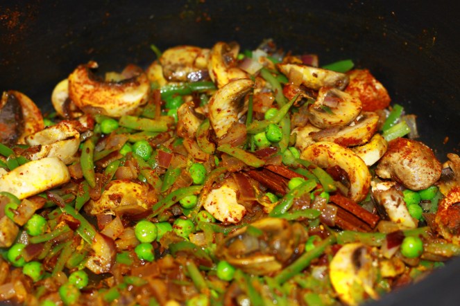 - Now add onions and allow to saute well. When done pop in the beans, peas and the mushrooms.