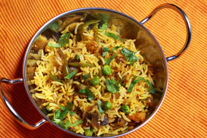 Mushroom & Peas Pulav slow cooked in spicy tomato gravy.