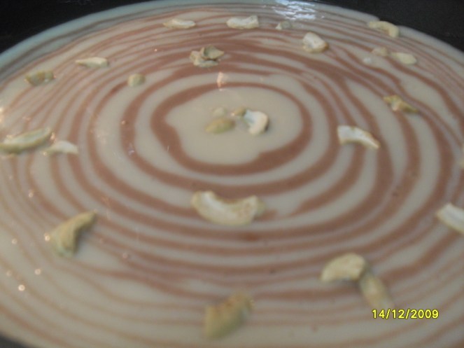 • Complete both the batters and sprinkle some broken cashew/almond nuts on the top of the batter.
