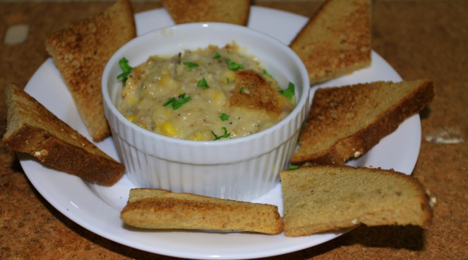 Corn Au Gratin served with Toast. (Corn cauliflower and herbs in white sauce baked with a cheesy crust)